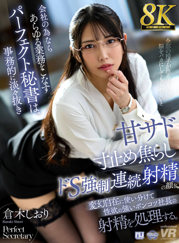 【VR】【8K】会社の為ならあらゆる業務をこなすパーフェクト秘書は、事務的に淡々抜き甘サド寸止め焦らしドS強●連続射精の顔を変幻自在に使い分けて性欲の強いポンコツ社長の射精を処理する。倉木しおり。ジャンル:ハイクオリティVR、単体作品、VR専用、独占配信、8KVR、フェラ、手コキ、ビジネススーツ、めがね、お姉さん、OL、秘書、中出し。出演:倉木しおり。シリーズ:unfinished VR。メーカー:unfinished。レーベル:Marrion Group VR。収録時間:94。